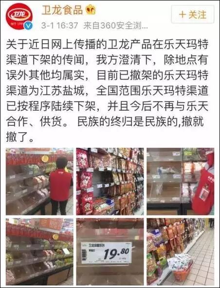 网上出现“辣条”生产商卫龙撤架乐天商场的消息