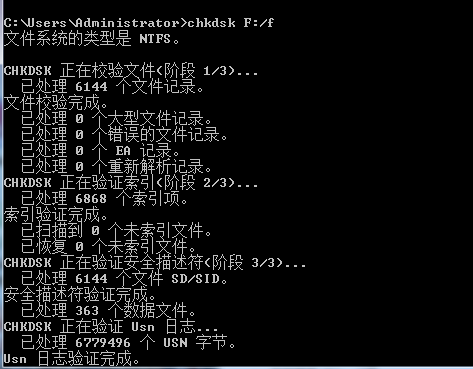 第二步:输入chkdsk G:/f(其中chkdsk是检查磁盘的意思,F是你U盘的盘符,f是修复的意思)。