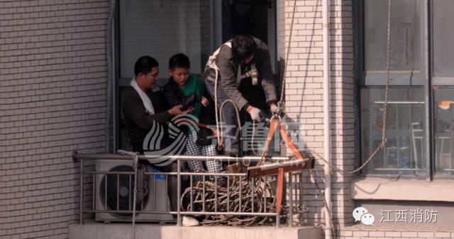 原来,这四位蜘蛛侠是外墙清洗工,事发当时正在他们正在附近工地作业,而身上背着的这些行头,就是他们的施工工具