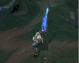 E技能本身的效果并不那么明显,但是由于这一款皮肤的剑圣手中剑刃非常特别,还是可以看出非常明显的E技能开启效果,剑刃从低端产生紫色光芒,并且形成十字标志在剑刃之上。