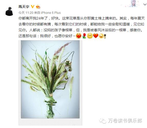 腾讯娱乐讯 今日(9月14日),马天宇在网上发文追忆去世母亲,他写到:“你都离开我24年了,好快。这束花草是从你那黄土堆上摘来的。其实,每年夏天去看你的时候都有摘,每次看到它们的时候,都能给我一些安慰和温暖,见它如见你。人都说:没妈的孩子像根草,但,我是被春风沐浴后的一根草,感谢你。还是那句话:我很好,也愿你安好”。