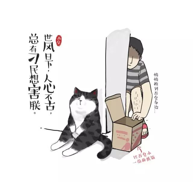 后来有一个朋友又送给我一只流浪猫,我就叫它们大吾皇和小吾皇。我的那些创作灵感也不完全是因为它们,另一部分是我会跟一些猫友们聊天,他们的猫有很多好玩儿的事情,我会把它进行一个再创作,然后融入到我的作品里面。