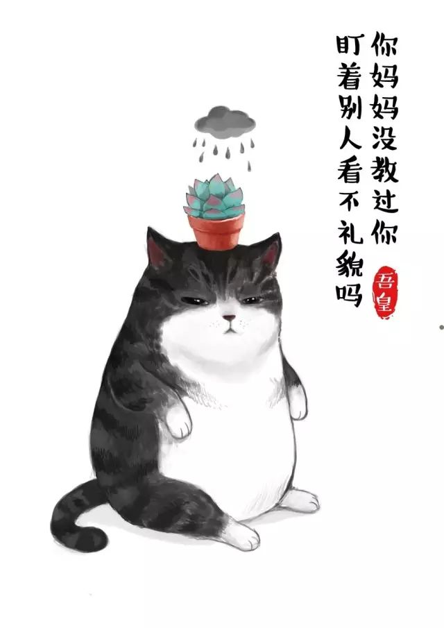 那个时候我回到家,看到自己家的猫,我看它不怎么搭理我,我就在一张画里面写了一句话,就以它的情绪讲了一句话,就讲“你妈妈没有教过你盯着别人看不礼貌吗?”然后当时我把这张画放在朋友圈的时候,大家特别喜欢。