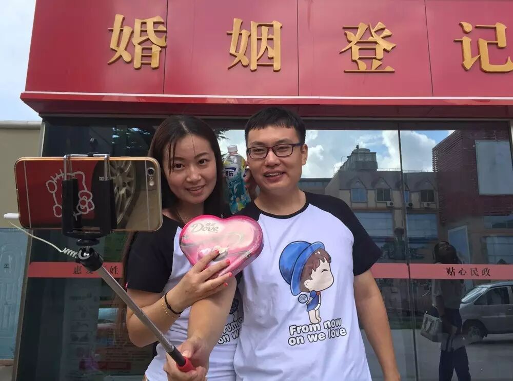 在市北区婚姻登记处大门外,业务还没开始办理,领了号的一对小情侣身着情侣装玩起了自拍,他们还特别准备了自拍杆,希望将这美好的一刻记录下来, 背后的“婚姻登记”几个大字定格在他们的合影中。