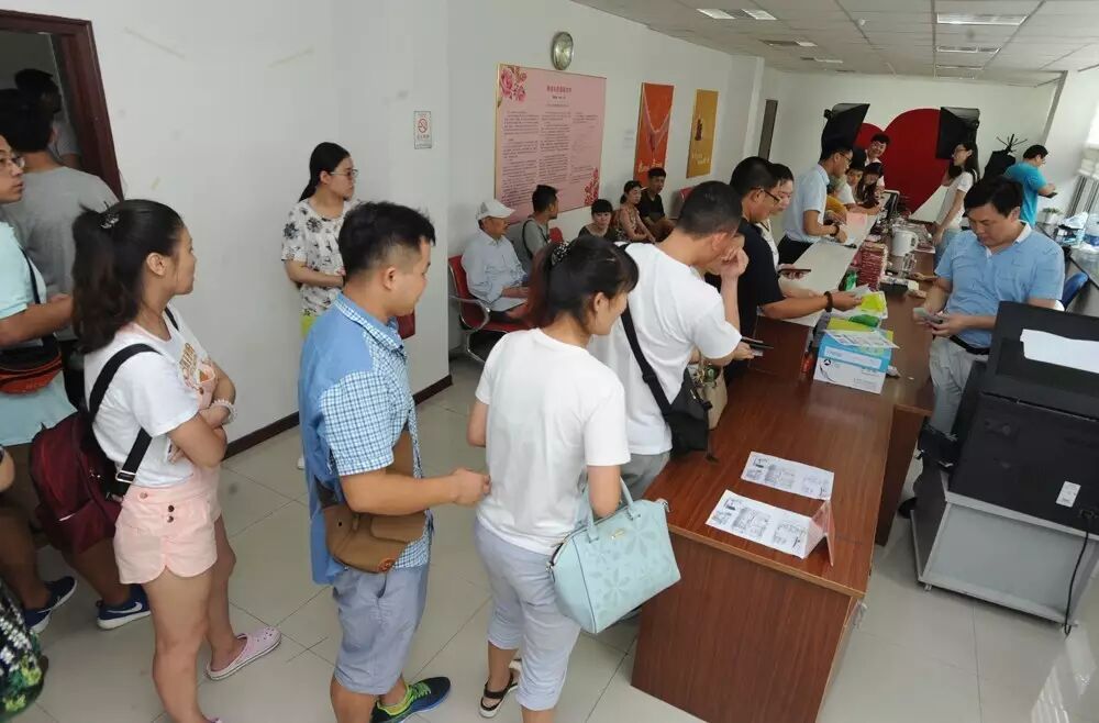 而在市北区婚姻登记处,有的新人更着急,凌晨4点就来了。上午8点半,记者赶到市北婚姻登记处时,抽号机显示已经出了50多个号,登记大厅内也挤满了情侣,不到9点就开始办理了。拍摄结婚证证件照、填表、办理结婚证……市北婚姻登记处5个窗口全部开放,只要资料齐全,很快就能拿到结婚证。