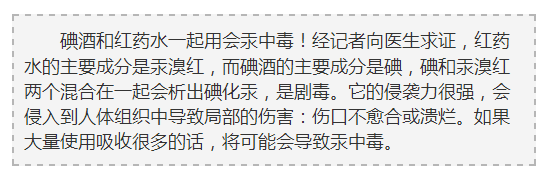 同时专家提醒,除了碘酒,碘伏也是含碘的,所以也不可与红药水混用。