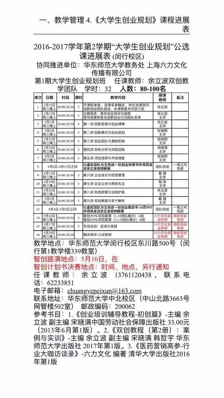 假如是本校本科生(由于种种原因没选上的)、在校研究生、博士生想得到学习和帮助的,就无需到校教务处办理申请注册,直接与卢智慧(我校研三创业者)报名,只要提出帮助与需求,我校创业教学团队从3月8日起(每周三晚6点-8点)在闵行校区第1教学楼3楼教师休息室接待。