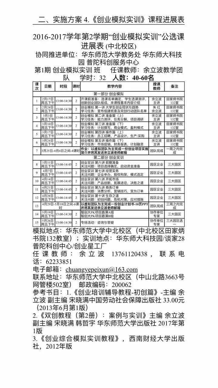 假如我校本科生还没有选课("大学生创业规划"课程2学分,每周三晚6点至8点45分,闵行校区第1教学楼339教室;“创业模拟实训”2学分,每周五下午1点至12点45分,中北校区田家炳书院132教室)的,欢迎大家在校教务处网上申报注册,学校统一截止日期为2月24日下午16点。