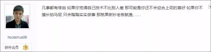 “凡事都有缘由,如果你觉得自己技术不比别人差,那可能是你还不会迎合上司的喜好;如果你不擅长拍马屁,只会踏踏实实做事,那就果断炒老板鱿鱼。”
