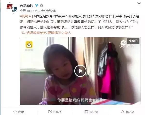 孩子妈妈孙女士说,这个事情大约发生在2年前,当时女儿6岁,儿子2岁,当时是早上,她和孩子们在床上玩儿,儿子手欠打了女儿。女儿平时都挺让着儿子的,很懂事。当时孙女士的手机正好在边上,她就录下来了,她也没想到女儿能说出这些话。