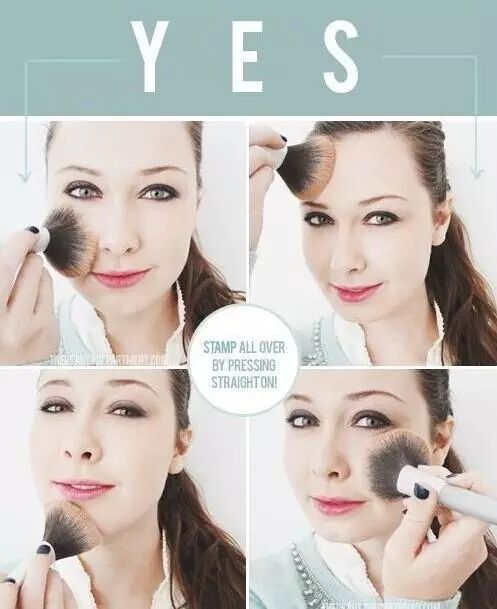 用散粉刷粘取散粉,从额头开始轻扫脸颊,然后用干净的散粉扑扫去脸上多余的粉质,三角区和容易出油的地方可用散粉扑再修饰一下。