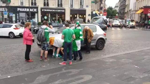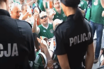 不但这样,爱尔兰连法国的女警官也敢撩。这个警察妹子面对这帮热情如火唱山歌的爱尔兰人,羞涩的低下了头....