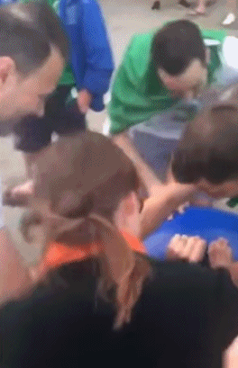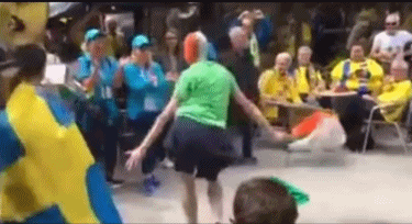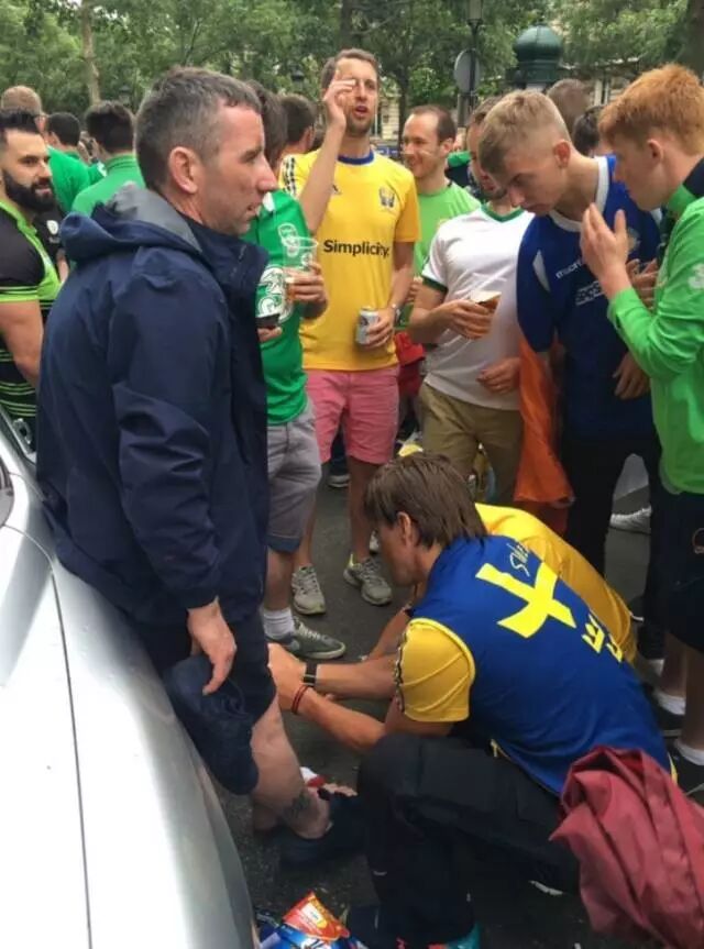 这个爱尔兰粉丝不小心腿受伤了,几个瑞典人耐心的蹲下帮他疗伤。