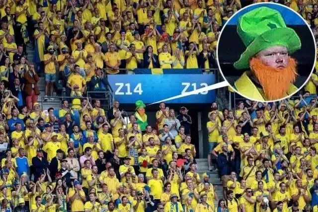比赛的时候,这两个国家的人根本也没有敌对的气氛。例如这个孤独的爱尔兰哥们,戴着绿帽站在对方瑞典的粉丝阵型里,完全不怕被打。