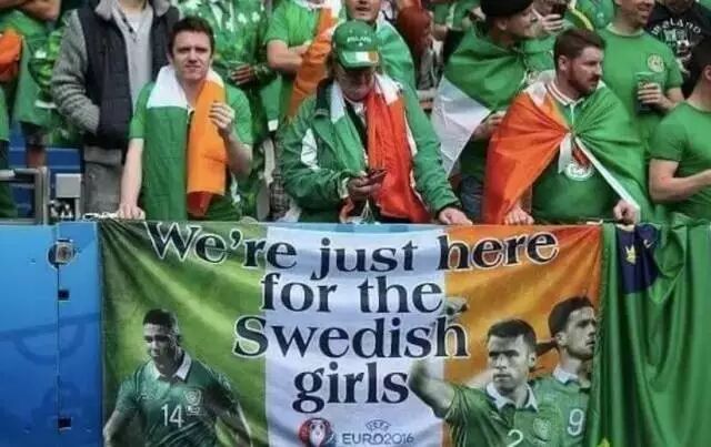 例如这个横幅,道出了爱尔兰人的野心和目的。“我们此行就是来撩瑞典妹子的!”