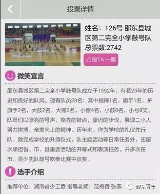 3.进入微未网界面,搜索126号邵东县城区二完小鼓号队,选择“投TA一票”。