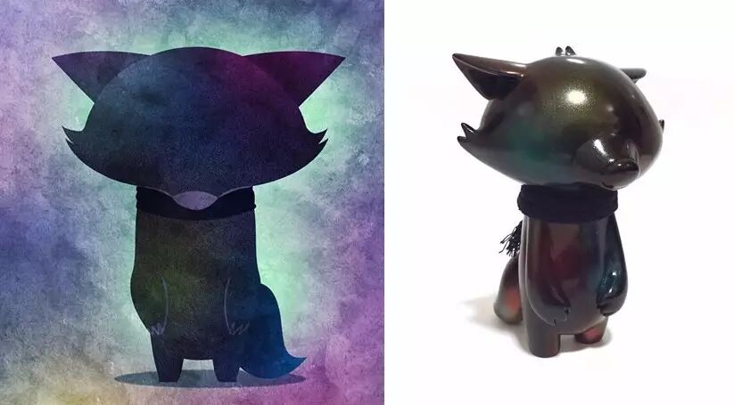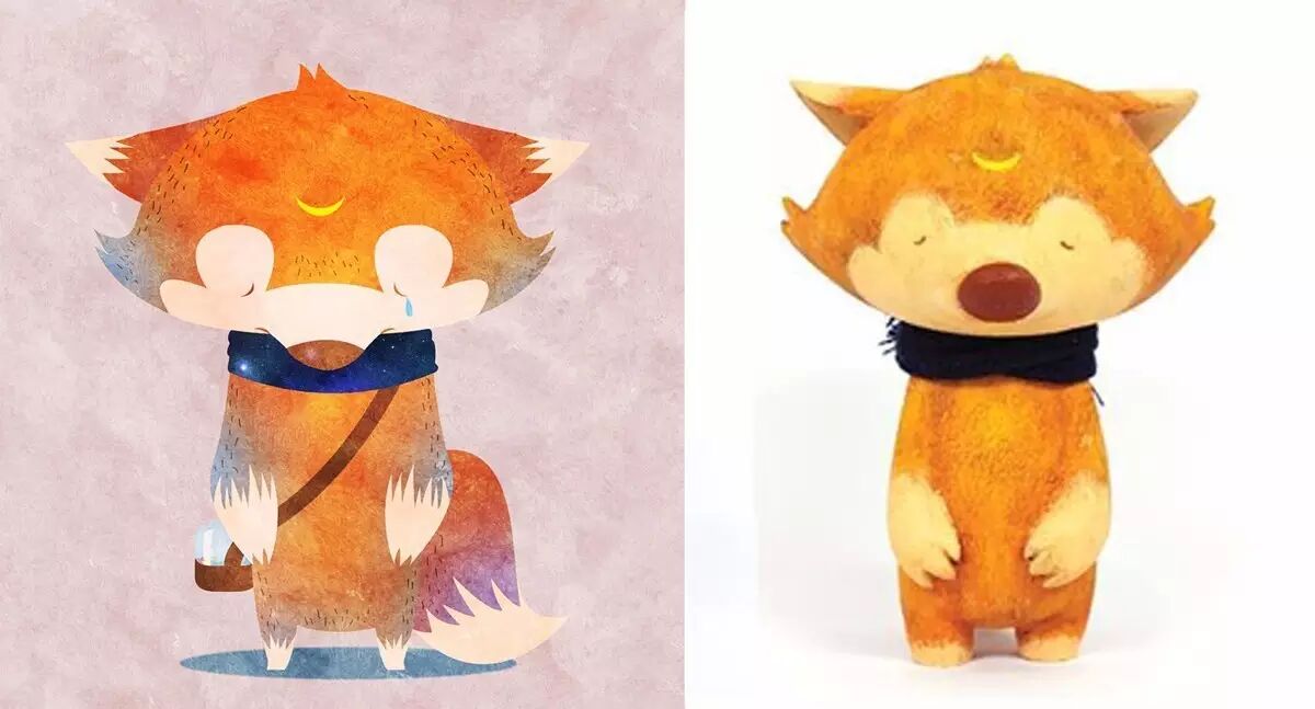 插画解说版还是挺形象的。有了作品的名字不难查出,那个一脸安宁状的小狐狸是 JOBI The Moon Fox,来自设计师二人组合 Ok Luna,O 为 Olais,K 为 Kaiser)。