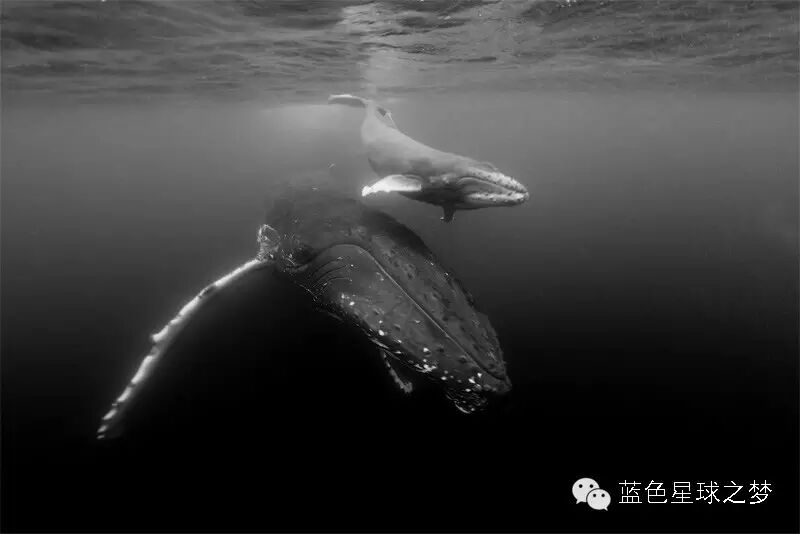 生活在海洋中的哺乳类动物也同样是如此。我三次去汤加拍摄大翅鲸,每一次都会见到这样的场景:在一片相对平静的海域,一只母鲸带着一只幼鲸在水中慢慢游动。有的时候,鲸妈妈索性停在那里不动,像是在休息,而活泼好动的鲸宝宝却一会儿上一会儿下,在母鲸周围转来转去。每隔一段时间,鲸妈妈都会用头将幼鲸托举到水面呼吸。