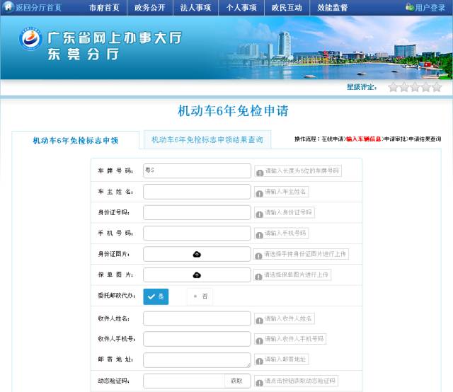 1、办理渠道省网上办事大厅东莞分厅网页,点击6年免检办理图标,按要求提交申请,如若提交信息符合办理要求,即可足不出户轻松办理。