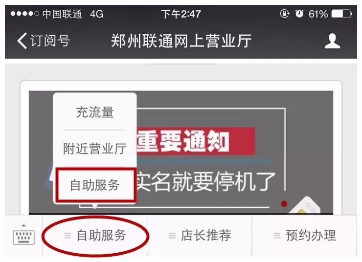 第一步:进入郑州联通网上营业厅,点击底部菜单“自助服务”,