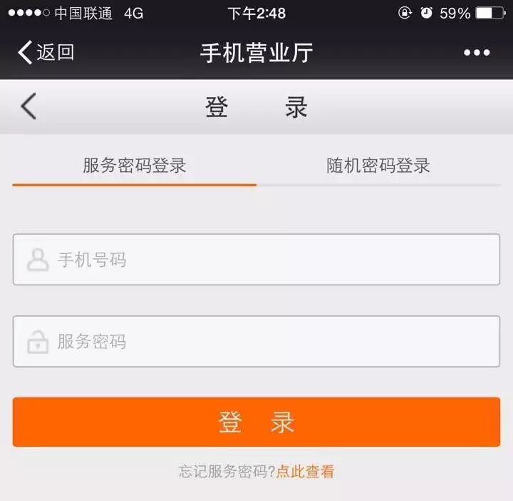 输入您的手机号码和服务密码登陆