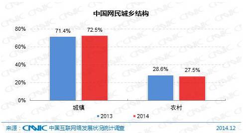 而根据《中国互联网络发展状况统计调查》的数据可以看出,截止至2014年12月,我国网民中农村网民占比27.5%,规模达1.78亿,而城镇网民占72.5%,城乡互联网普及率存在巨大差异。