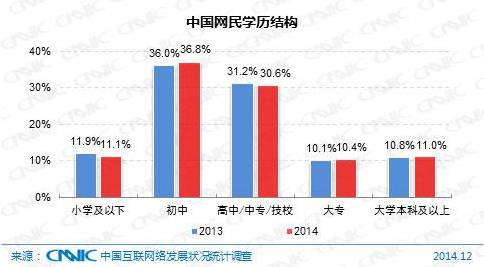与此同时,网民中具备中等教育程度的群体规模最大,初中、高中/中专/技校学历的网民占比分别为36.8%与30.6%。