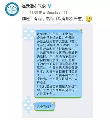 今天,不少港城人的微信、QQ都收到一条关于“连云港召开防汛紧急会议称将有特大暴雨”的消息。这是真的吗?