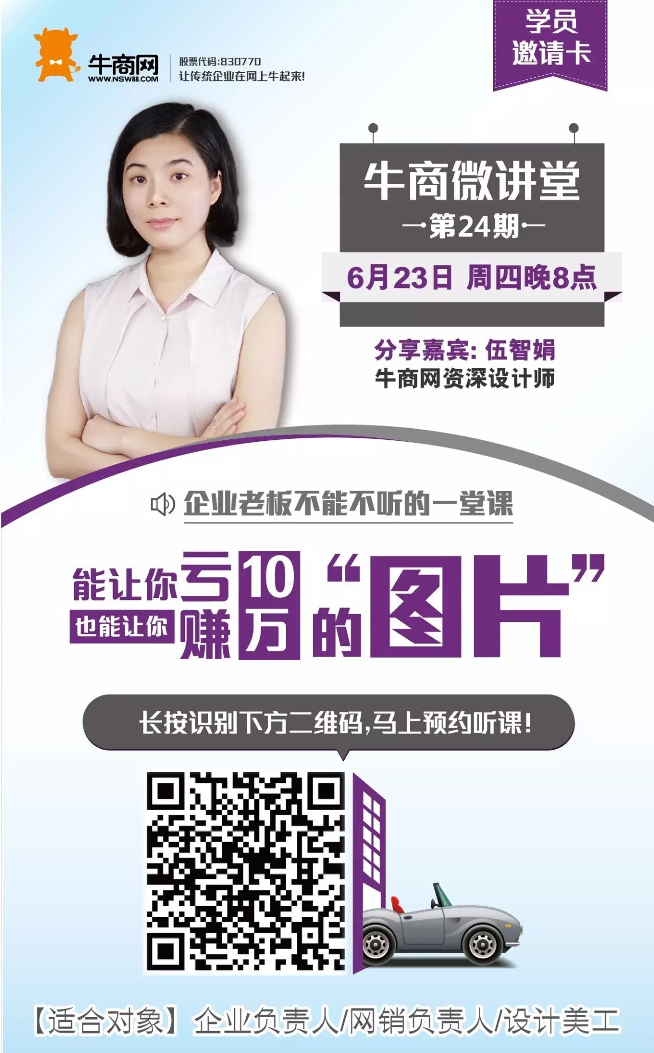 今天晚上8点,牛商微讲堂特邀牛商网资深美女设计大神伍智娟老师为大家分享《能让你亏10万也能让你赚10万的“图片”》,为你揭晓关于“图片”老板不能不知的3件事!