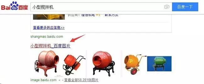 比如说客户在百度搜索“小型搅拌机”的时候,百度图片会显示在搜索结果的前列,如上图,客户不一定会去看网页,去看图片的可能也会很大,毕竟看下整个外形,在选购时,心里也会有底。