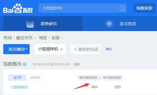 “小型搅拌机”的竞争度有点大,如上图所示,百度指数都已经去到460人了,不算特别长尾,想要图片排在前面,不太容易。