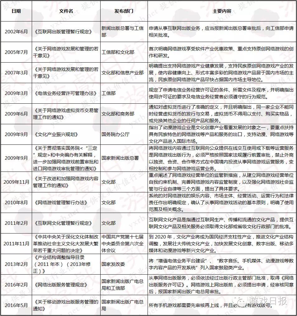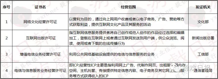 自6月2日发布《关于移动游戏出版服务管理的通知》,明确了所有手机游戏都需要先审核再上线,并且必须要有游戏版号以来,终于这一通知要在7月1日正式执行,。 在这条通知发布之初,就在游戏行业激起了千层浪。此前,移动游戏如果要上线,常规做法是只要做个游戏备案,并不需要游戏版号,下发的通知则明确了移动游戏出版管理流程,将移动游戏出版包含在网络出版管理之中,出版流程和一般网络游戏出版流程无异,均需先申报版号,然后才能上线收费运营。 这一规定不仅影响到了国内各大渠道商,就连App Store也同样没有幸免。不久前,iTunes官网推送了一则新闻,,开发者需在“App审核信息”部分的备注字段输入游戏类App的批准号码和批准日期。 不过据部分业内人士表示,如果developer account注册信息不在国内,就看不到这个新闻,因此猜测这一规定可能不针对国外的开发商。 可见,作为游戏从业者,,,为大家提供相关的信息。 游戏行业属于互联信息服务的子行业之一,。、工信部、,以上相关部门在各自职责范围内依法对涉及特定领域或内容的互联网信息服务实施监督管理。 另外,游戏行业自律机构包括中国音像与数字出版协会游戏出版工作委员会和中国软件行业协会游戏软件分会。 :针对游戏行业,其主要负责拟订游戏产业的发展规划并组织实施,指导协调游戏产业发展;。 工信部:主要负责拟订产业发展战略、方针政策、总体规划和法律法规草案;制定电子信息产品的技术规范;,实行必要的经营许可制度以及进行服务质量的监督。 :具体到游戏行业,其主要负责对游戏出版物的网上出版发行进行前置审批。国家版权局主要负责游戏软件著作权的登记管理工作。 中国软件行业协会游戏软件分会:隶属于工业和信息化部的全国性行业组织,主要职责是配合、协助政府的游戏产业主管部门对我国从事游戏产品开发、生产、运营、服务、传播、管理、培训活动的单位和个人进行协调和管理。 中国音像与数字出版协会游戏工作委员会:是游戏相关产业单位自愿组成的全国性行业组织,其宗旨是维护游戏出版经营单位的合法权益,促进本行业的产业发展、学术交流、技术进步。 游戏公司经营许可 根据业务经营范围的不同,游戏公司所需要取得的许可证不完全相同的,但主要包含以下几种: 此外,游戏日报还搜集了游戏行业主要法律法规及相关的政策,供大家参考。