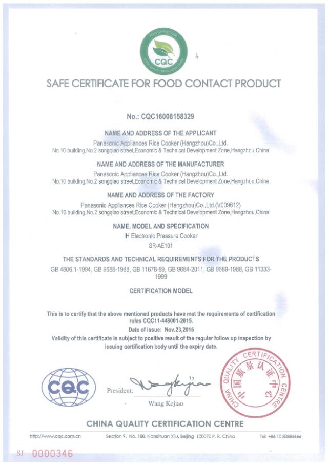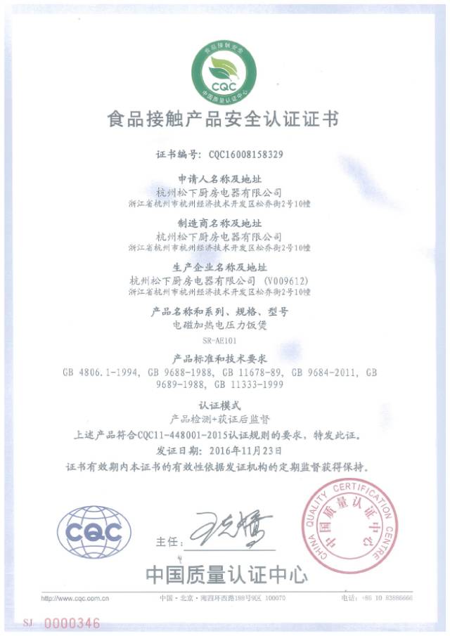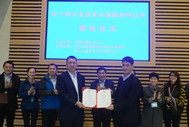 2016年12月6日 ,中国质量认证中心(以下简称CQC)在浙江省检验检疫科学技术研究院为杭州松下厨房电器有限公司颁发了“食品接触产品认证证书”。