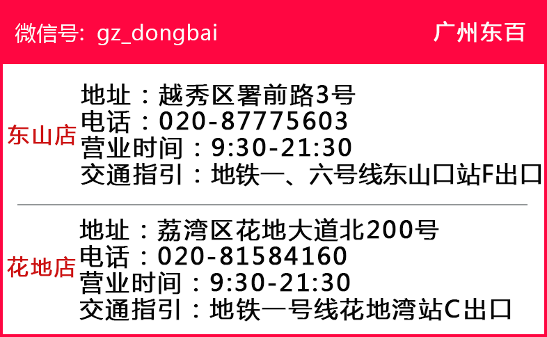 优惠预存地点:越秀区署前路3号(东山百货大楼7楼收款台)、荔湾区花地大道北200号(东百花地湾百货富一层收款台)