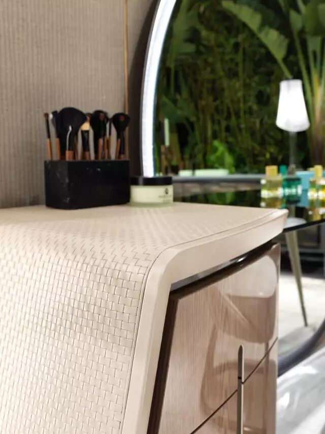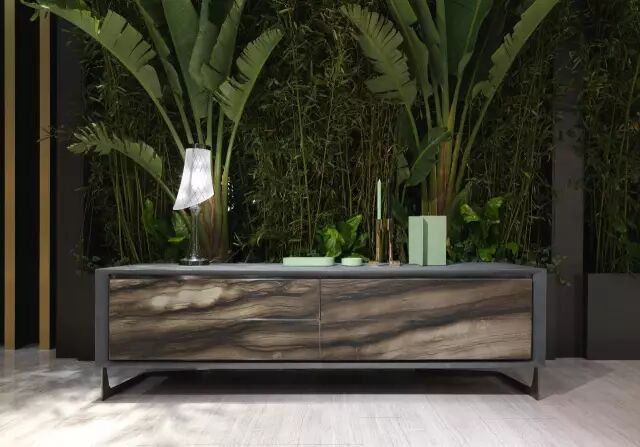 家具的侧面并不对称,但在边角上创造了一个弧度,用皮质和钢材做装饰,抽屉正面和用皮革涂饰的红杉棕色大理石门,是很大的外观震撼。所用的大理石和Sowilo小桌子和Zenit床头柜的是一样的。