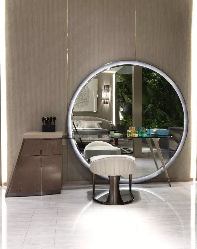 全身长圆镜,直径180厘米,线条丰富和优雅,它的特色是一个拥有高厚的不锈钢拉丝圆锥框架和为了提供便利背景光。