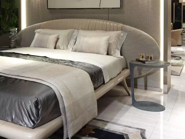 床来自线条柔和和紧致,低调优雅的灵感。主角是完全被皮笼盖的脚跟和双面涂布的椭圆床头,。